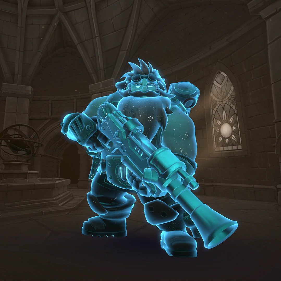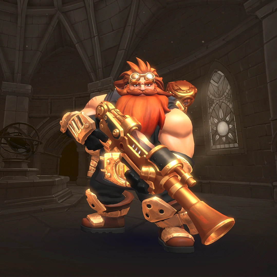 In his base kit, Barik's primary fire is Blunderbuss which fires multiple pellets with a large spread and limited range, dealing hefty damage in a single well-placed shot. Barik's secondary fire is Barricade a tall barrier that can protect Barik and his team from fire. Turret, Barik's primary ability allows him to place up to two turrets that do supplemental damage, hitting targets with projectile shots, fit for the close-quarters area that Barik specializes in. Barik's movement ability is Rocket Boots allowing him to quickly dash forward at high speed and fast control, mixed with his small size he becomes a harder target to hit. Barik's Ultimate ability is Dome Shield deploying a powerful flamethrower turret protected by a large dome-shaped shield, ideal for area denial and immense damage output within its radius.