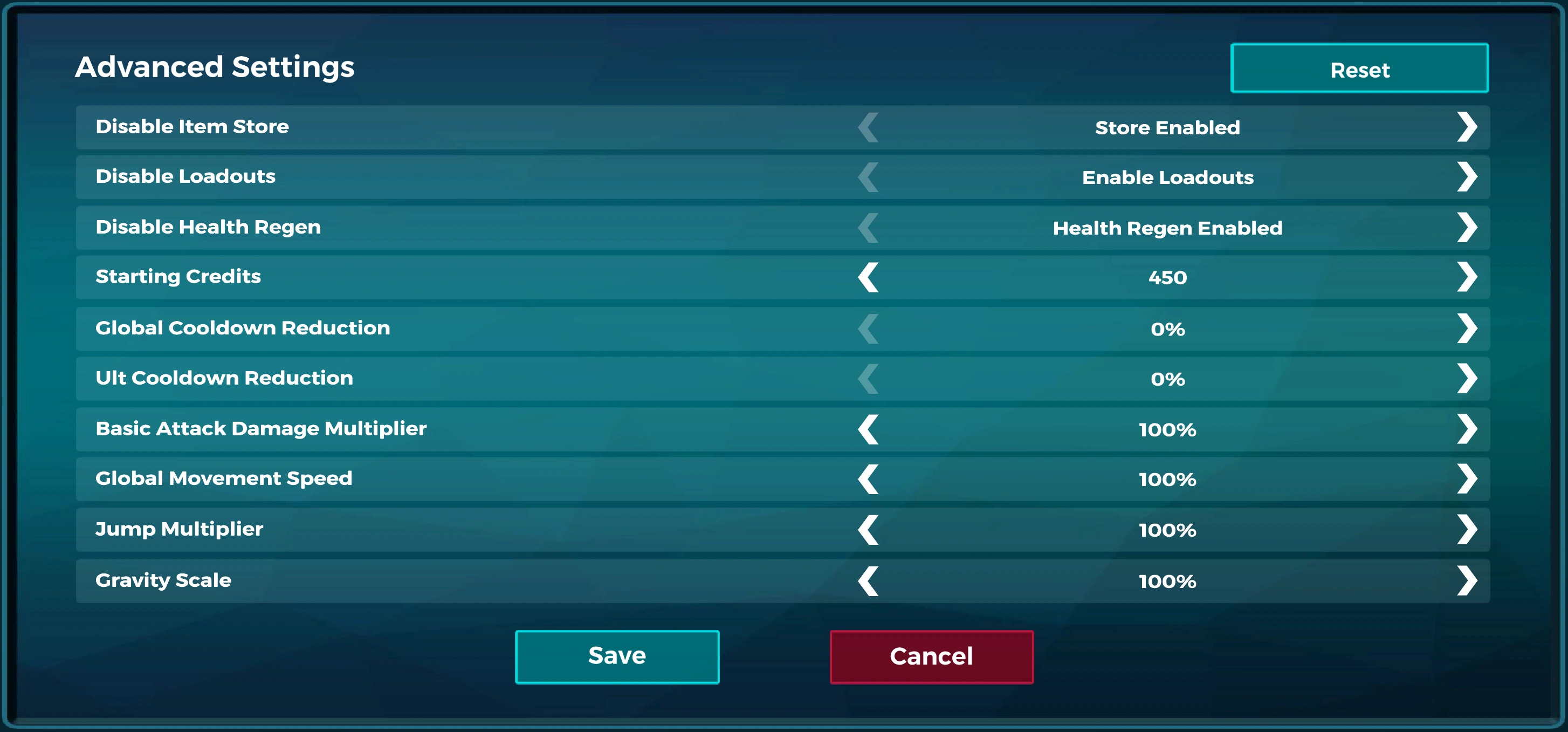 - Only the settings that were on screen while pressing the save button will take an effect in match. For example: disabling the store, scrolling all the way down, pressing the save button and then starting the match will cause the store to still be enabled in the game. This means that the options like Disabled Anti-Healing and Customized Gravity Scale cannot be both working in the same match because they cannot be on the advanced settings screen at the same time.