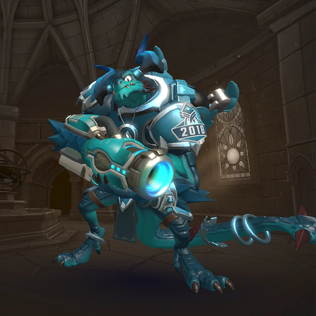 Drogoz is a heavy output damage champion with high vertical mobility. His weapon of choice, a rocket launcher, fires rockets in the desired direction without falloff damage nor change in velocity. Any enemy hit by Drogoz's loogie spit will take additional damage from his rockets. The loogie can also be shot mid-air, exploding it and doing damage to enemies based on their proximity to the explosion, making it an excellent attack tactic for around corners and in enclosed areas. Drogoz's skill, Salvo, loads all remaining rockets into his launcher, allowing them to be fired rapidly with a single click. To maneuver the map, Drogoz uses a jetpack that relies on a fuel reserve that gradually refills when not in use. To change his firing position and escape potentially dangerous situations, Drogoz can use his jetpack's Thrust ability to quickly project himself into the air and forward. This thrust does not consume any fuel and can be used even when his reserve is empty.