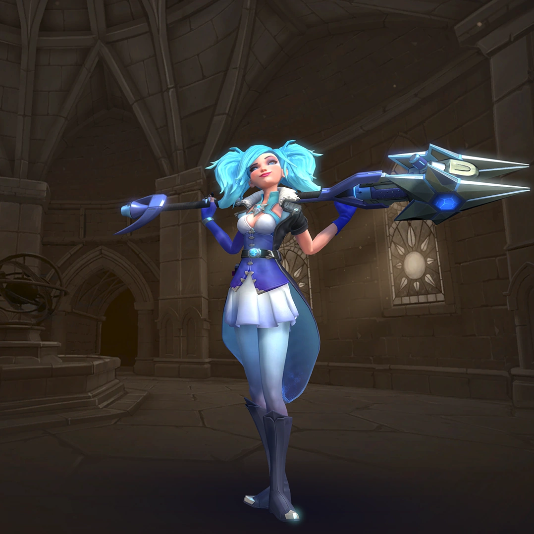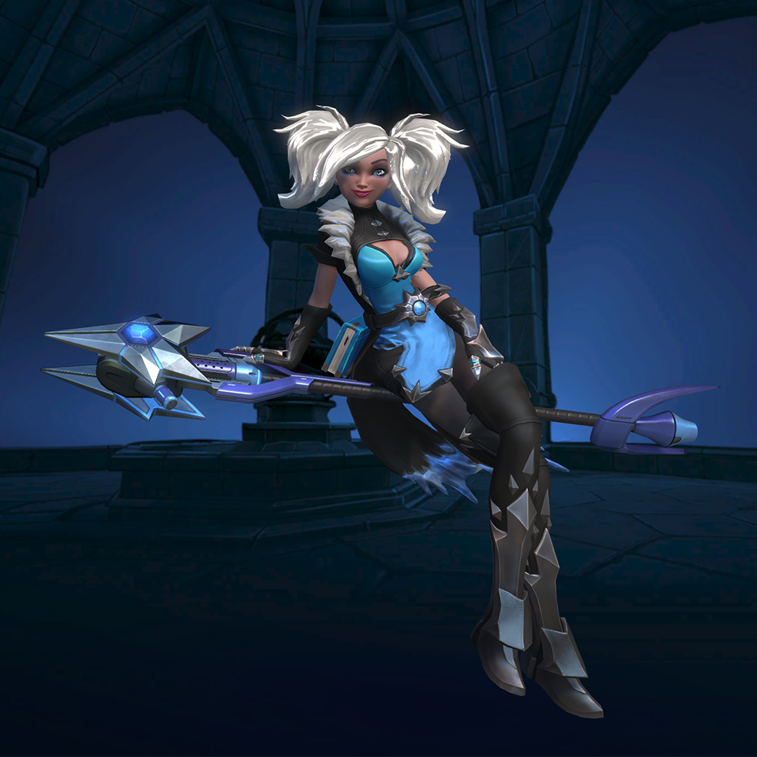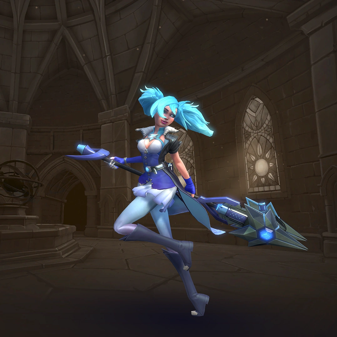 Evie is a flank champion with very high mobility. Her weapon, the Ice Staff, lets her fire high damage explosive shots every second. Her two movement skills, Blink and Soar, allow Evie to appear and disappear behind enemy lines and wreak havoc, while Ice Block gives her up to three seconds of invulnerability. Her ultimate skill (Ice Storm) will damage, slow, and cripple enemies in a large area. This provides her with a strong teamfight and zoning tool. However, Evie has a low Health pool and heavily relies on her maneuverability to stay alive. Managing her cooldown well can turn her into a fearsome flank.