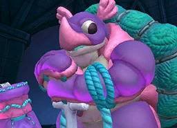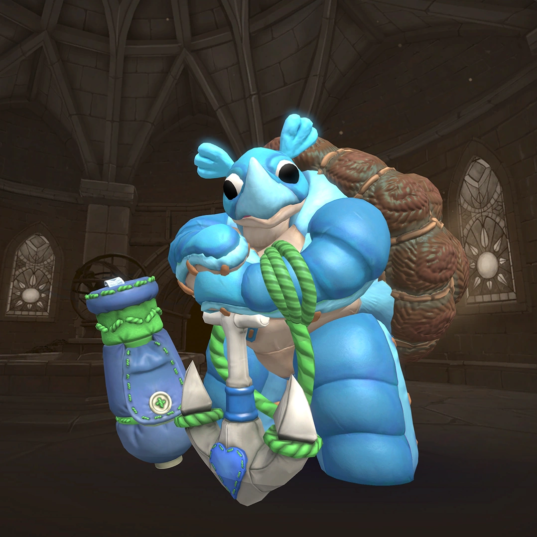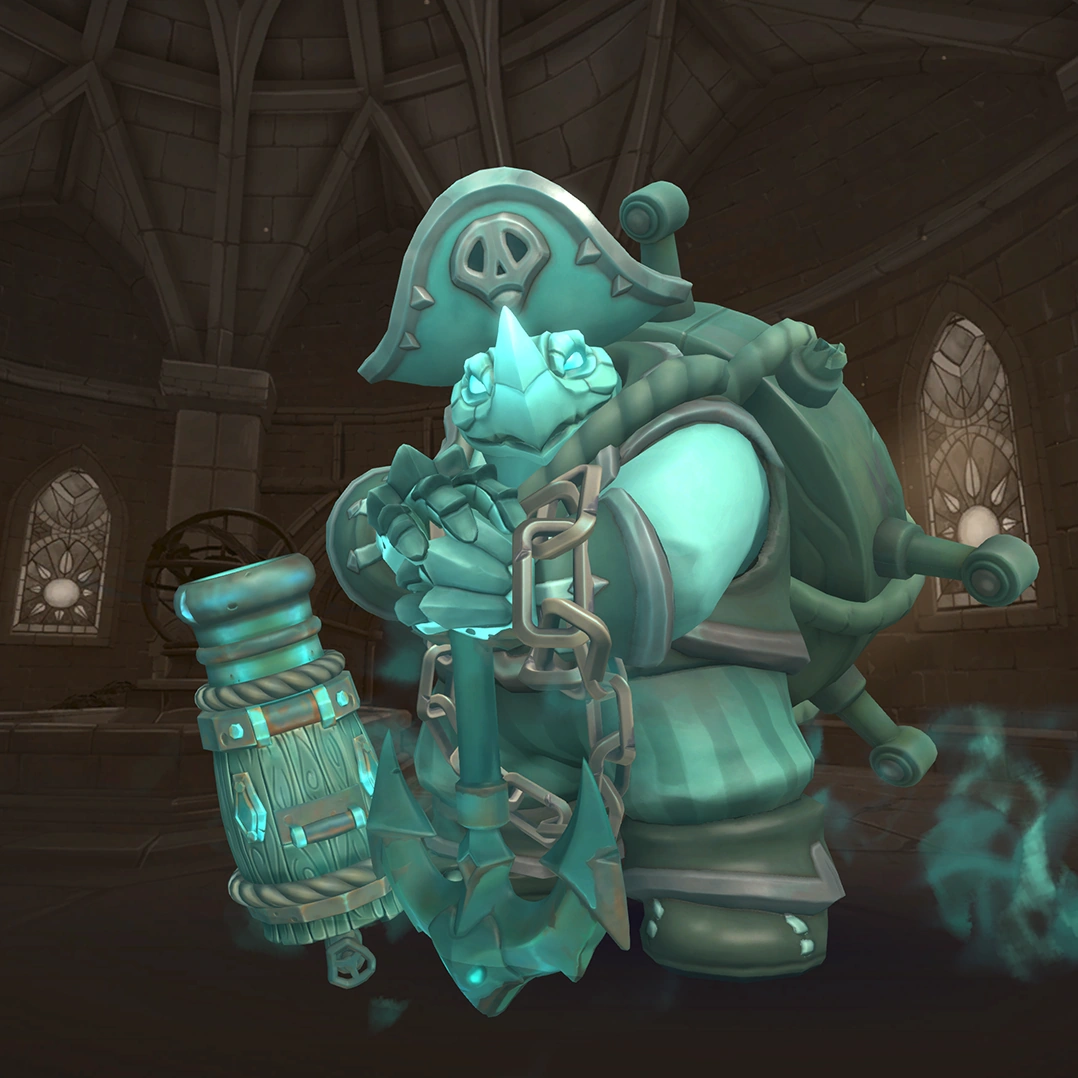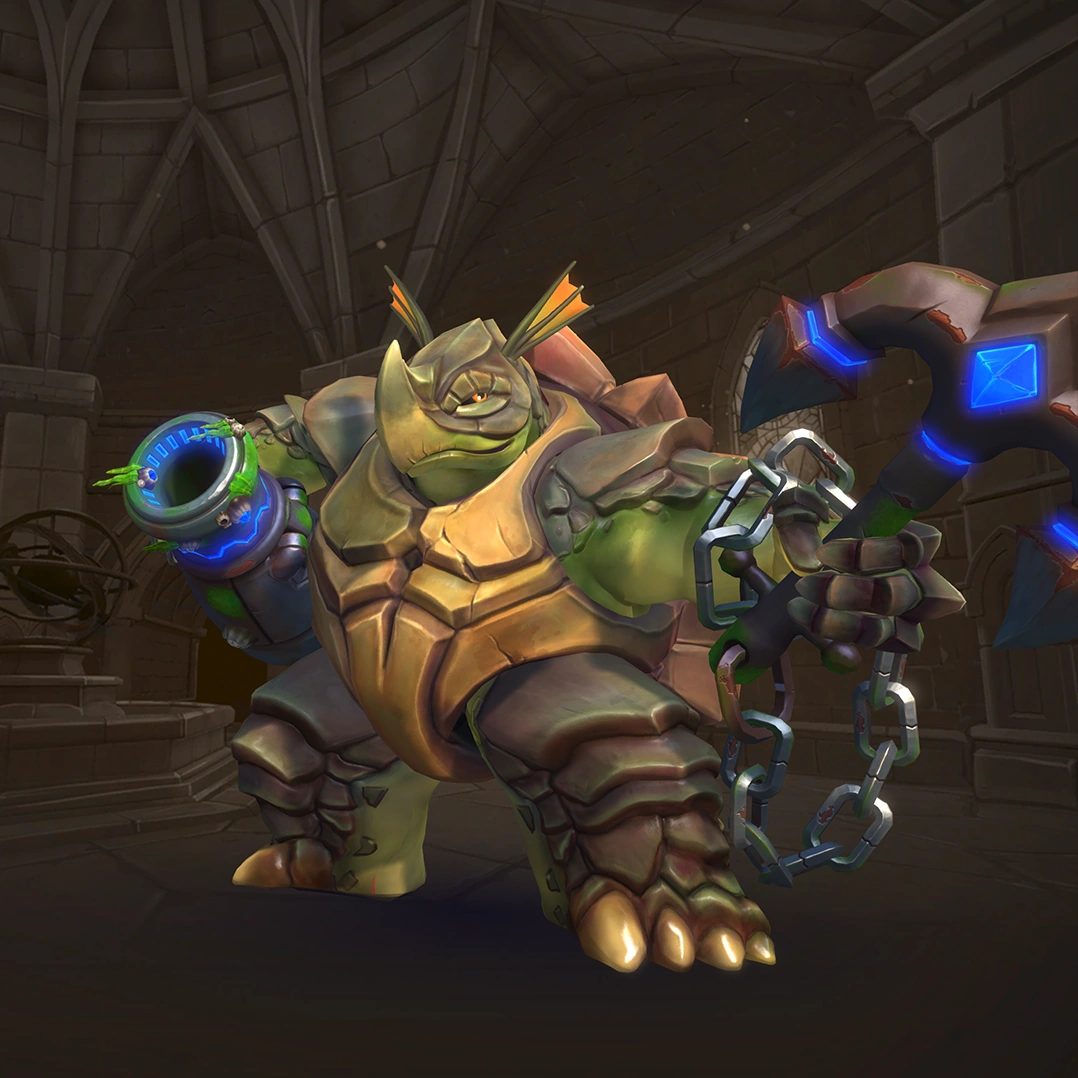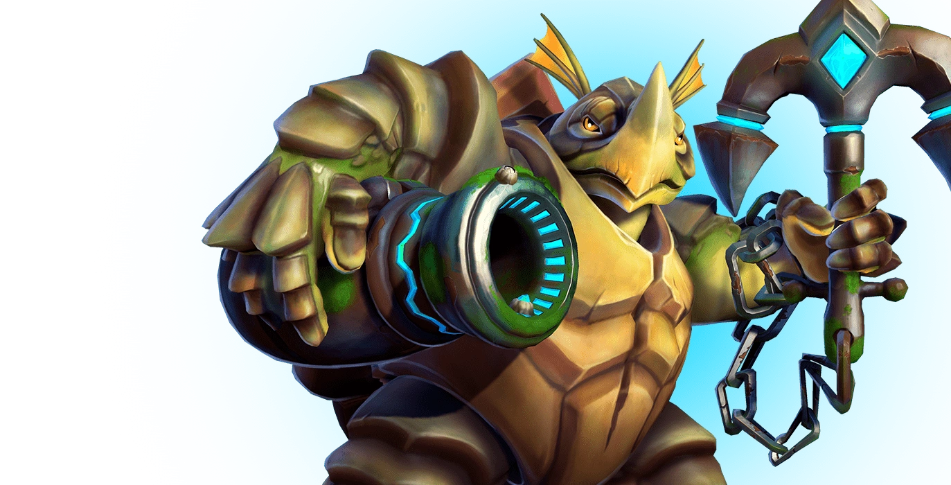 Makoa is a front line champion able to soak up large amounts of damage and a wide hitbox, making him ideal for defending his allies from enemy fire. His cannon shots are quite slow and have a steep drop off of trajectory and damage but can still be dangerous. Dredge Anchor allows Makoa to pull in enemy champions to leave them at the mercy of his teammates. Shell Shield spawns a large, round shield around Makoa for a duration, while Shell Spin allows him to quickly reposition himself even while his shield is active. Makoa's ultimate skill, Ancient Rage, will increase his maximum health, fully heal him and change his weapon shots for wide melee attacks that can hit multiple targets per swing, making it an ideal skill for turning the tides of battle around.