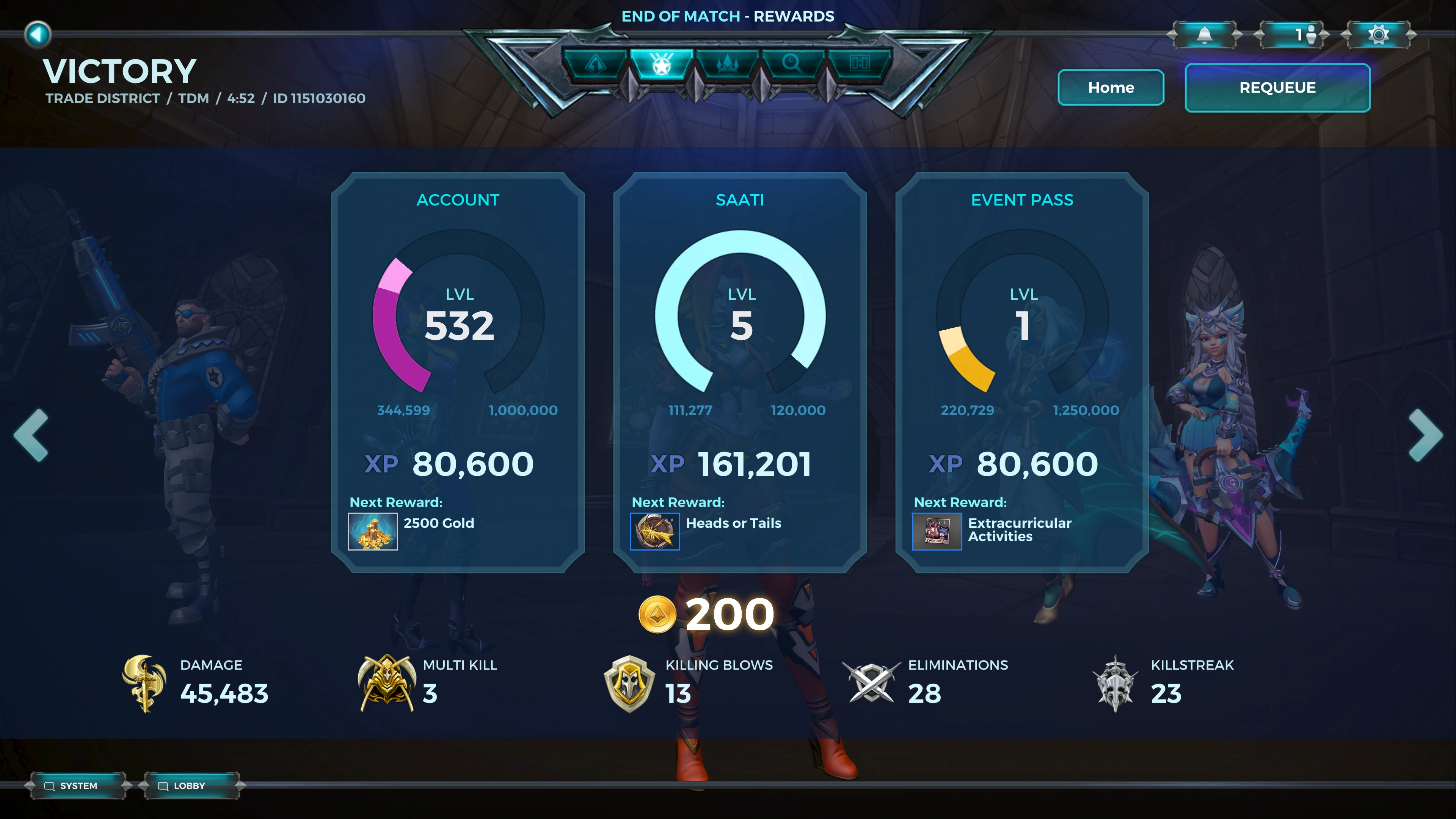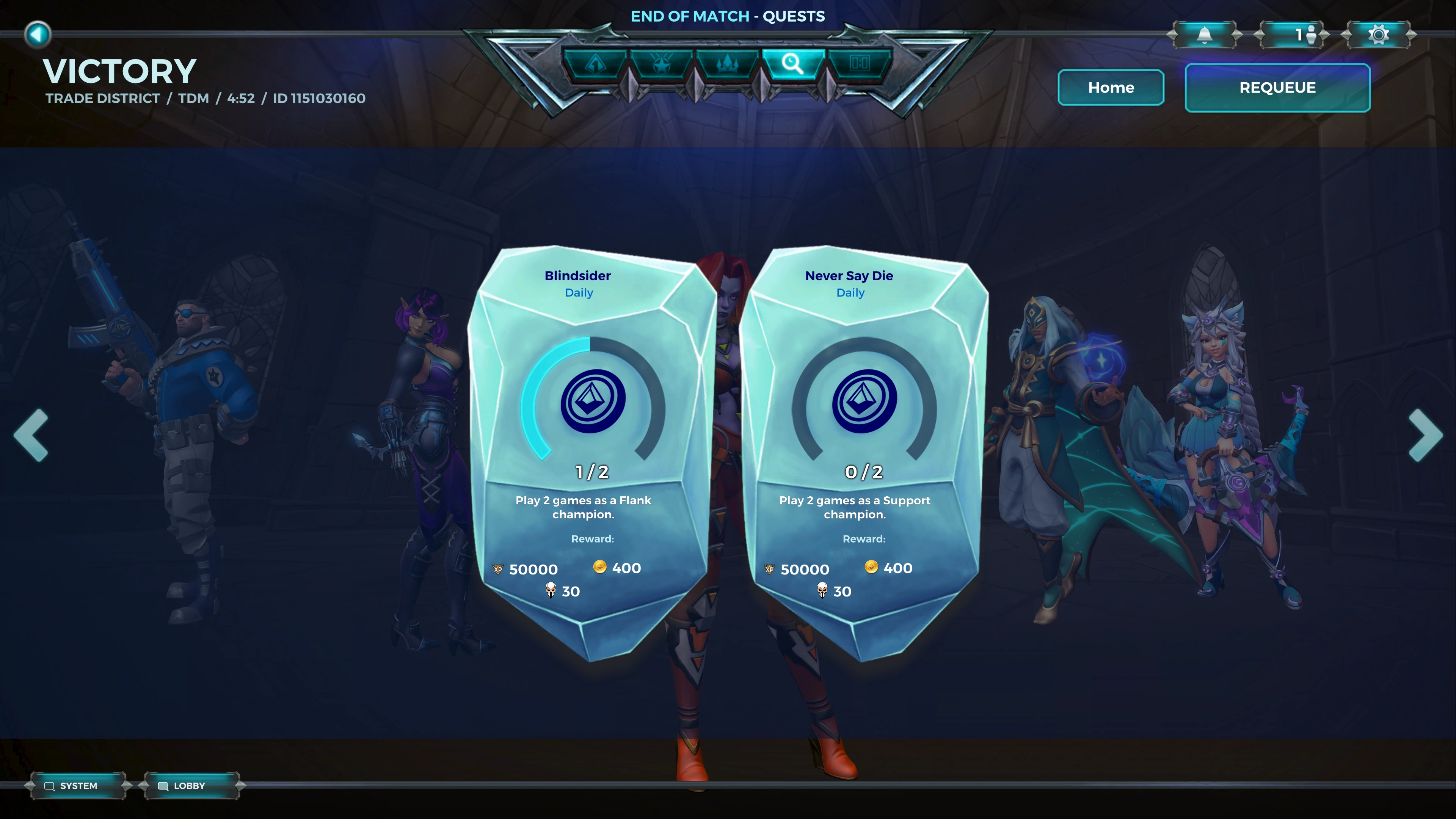Players land in the Post-Match Lobby Landing Screen after a match finishes. In this screen all information of a game is displayed in several tabs.