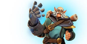 Torvald is a supportive Front Line Champion whose primary contribution to battle is shielding for himself and allies as well as crowd control against critical enemies. Unlike other Front Liners, Torvald's shielding is consistently present and must be destroyed in order to damage his hit points. His primary weapon shoots low damage energy blasts from his gauntlet that have significant damage falloff, limiting his effective combat range. His CC ability, Nullify, damages an enemy and prevents them from using their abilities besides their primary attack for a duration of time, leaving them susceptible to his teammates. In times of danger, Torvald can throw a temporary shield onto an ally using Protection, provided he has line of sight of the ally and that they are within range. Torvald is also able to recharge his own shield, allowing him to survive for extended periods of time on the point or in battle. Torvald's Ultimate, Hyper Beam, significantly slows him down at the cost of using the full might of his gauntlet. His gauntlet will shoot out a large beam of energy, dealing 1150 damage over its duration and knocking back any enemies in its path. This Ultimate can be aimed throughout its duration, pushing enemies off the point or into environmental hazards.