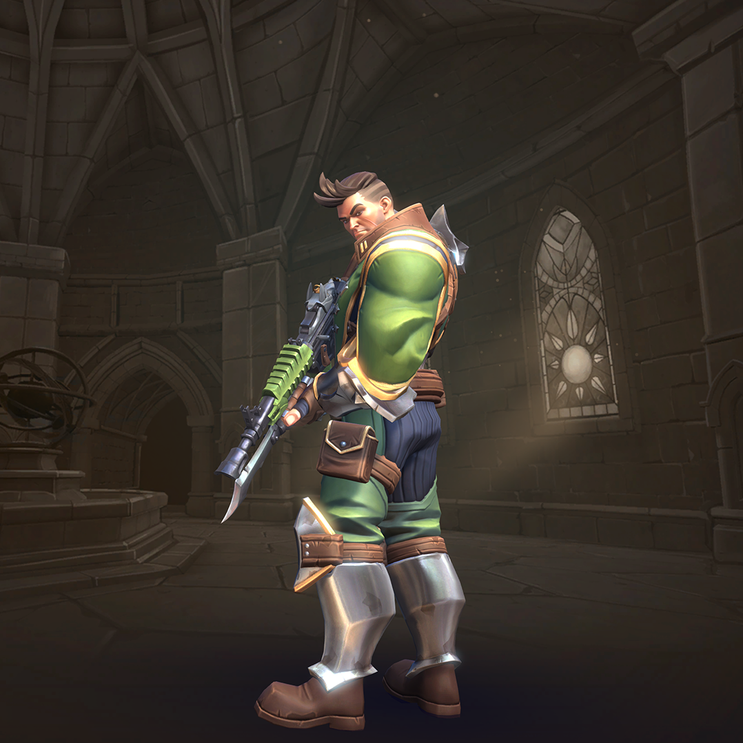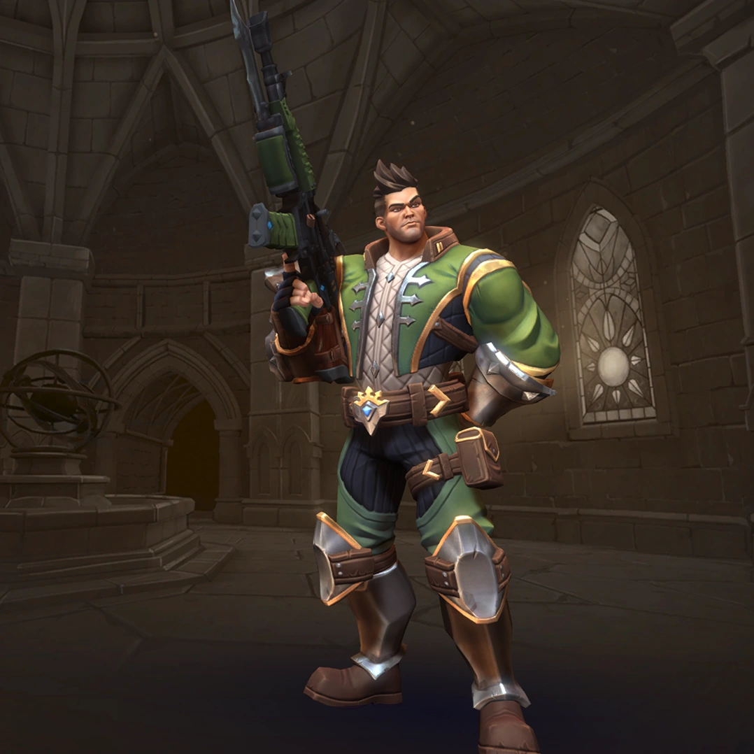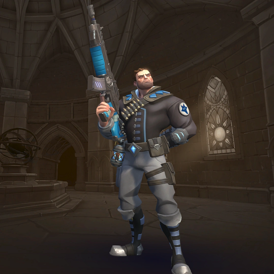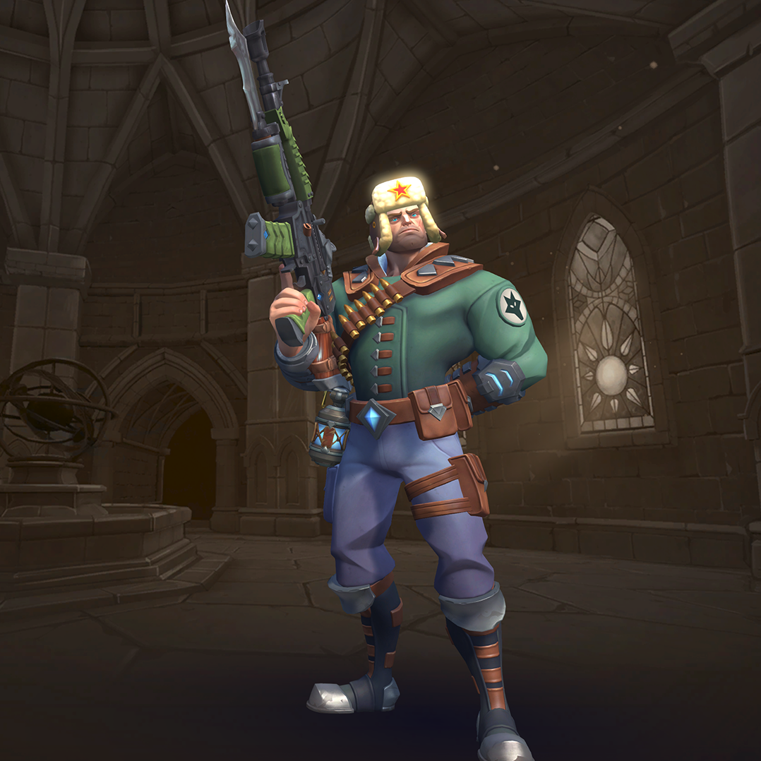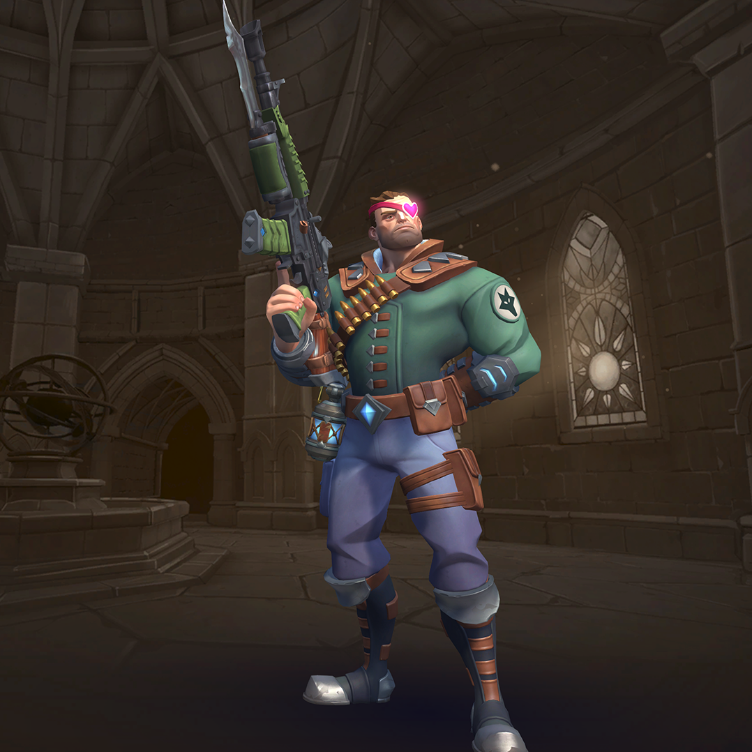 Viktor is a damage champion with very high damage output and one of the easiest champions to use (for those who are used to various military shooters). His Assault Rifle fires with a high rate of fire but low accuracy, though his Iron Sights ability allows him to significantly improve this accuracy at the cost of his movement speed. His Frag Grenades deal area damage and can be cooked before thrown so they explode earlier. His Hustle allows him to run in and out of fights and gives him limited flanking capability. His ultimate skill, Barrage, allows him to deal high damage in large areas making it a great tool for clearing areas and forcing enemies to disperse.