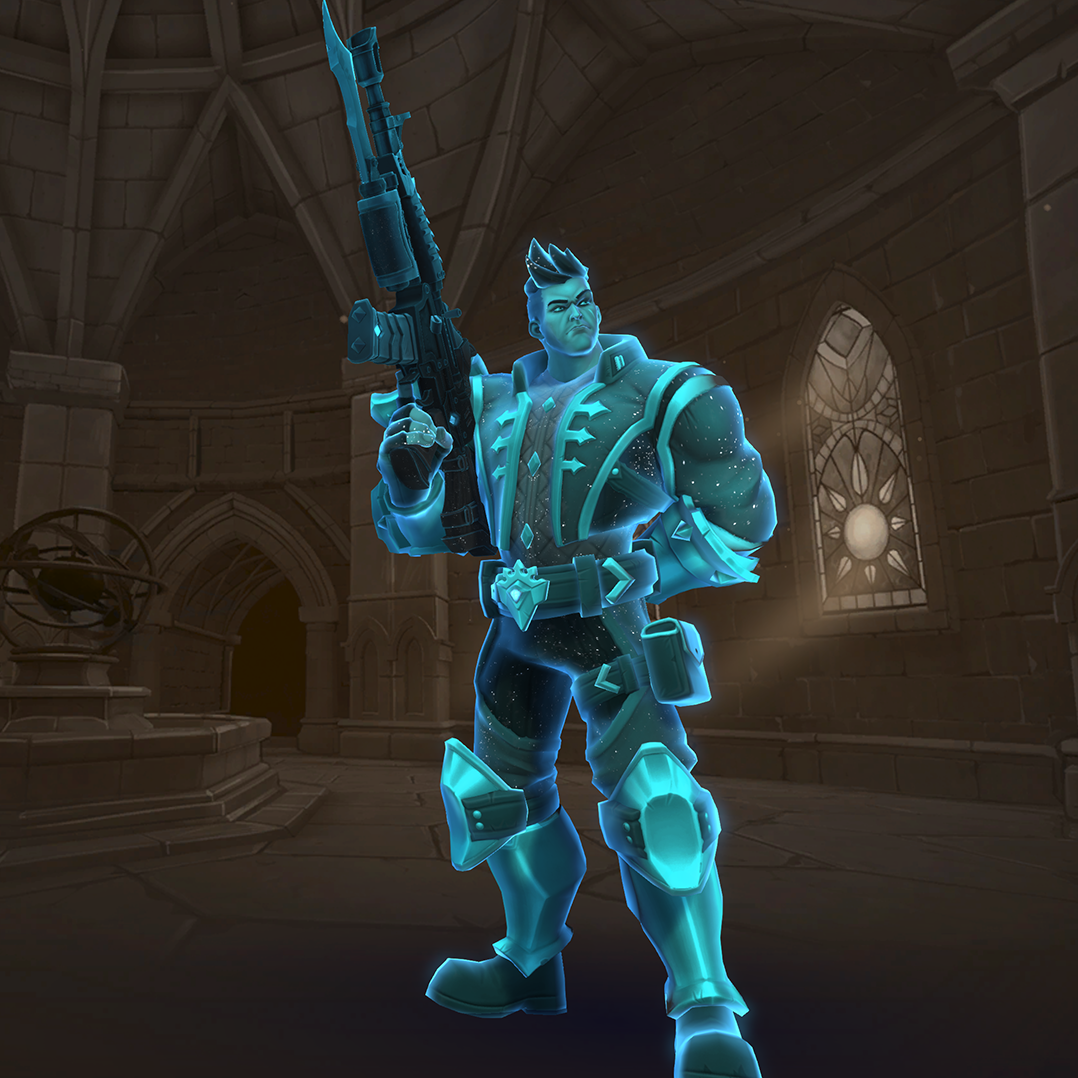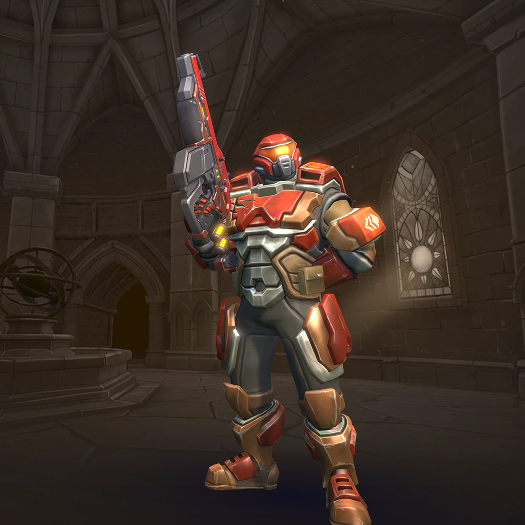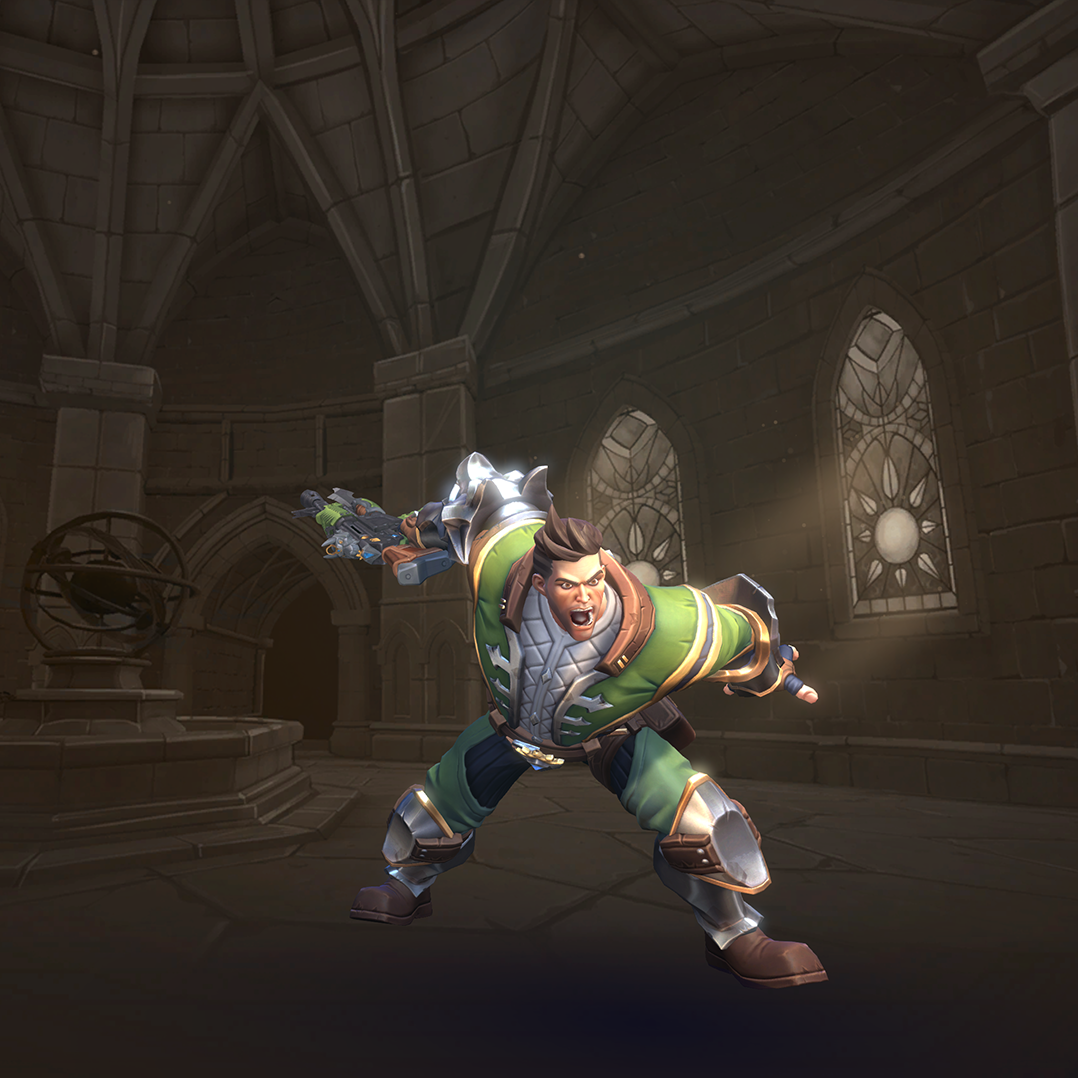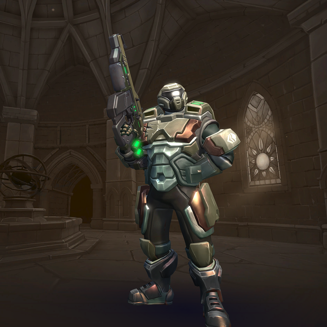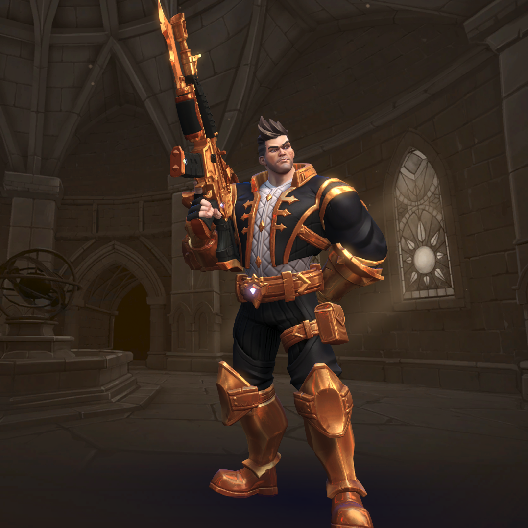 Viktor is a damage champion with very high damage output and one of the easiest champions to use (for those who are used to various military shooters). His Assault Rifle fires with a high rate of fire but low accuracy, though his Iron Sights ability allows him to significantly improve this accuracy at the cost of his movement speed. His Frag Grenades deal area damage and can be cooked before thrown so they explode earlier. His Hustle allows him to run in and out of fights and gives him limited flanking capability. His ultimate skill, Barrage, allows him to deal high damage in large areas making it a great tool for clearing areas and forcing enemies to disperse.