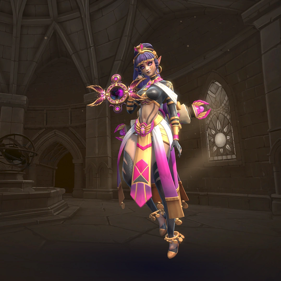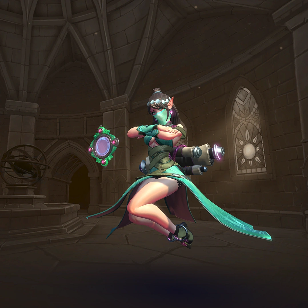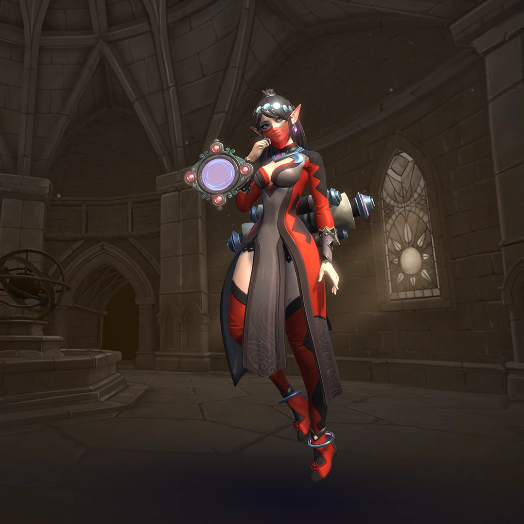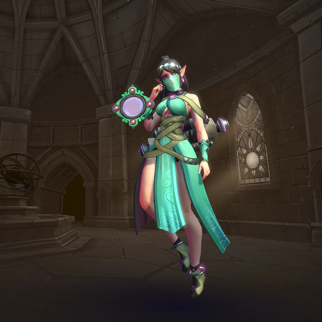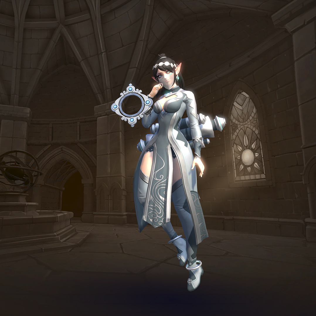 Ying's primary weapon is Illusory Mirror which fires rapid beams of energy to output respectable damage in a short time, all the while remaining perfectly accurate. Shatter, Ying's secondary fire, activates her illusions, causing them to seek out enemies and explode after a short fuse dealing damage, acting as burst damage. Ying's primary ability Illusion summons a replica of Ying, that focuses on healing the lowest health ally, these illusions have all the same physical traits as the real Ying minus her abilities and health. Dimensional Link is Ying's movement ability that teleports Ying to the closest Illusion Ying is looking at. location swapping spots with it, allowing her to quickly reposition herself. Ying's Ultimate ability, Illusory Rift, clears all negative effects off herself and her allies and gives rather strong map-wide healing, which also allows her movement skill Dimensional Link to teleport to an ally. Ying has a passive Slow fall which reduces the speed at which Ying falls and makes her have slightly slippery controls.